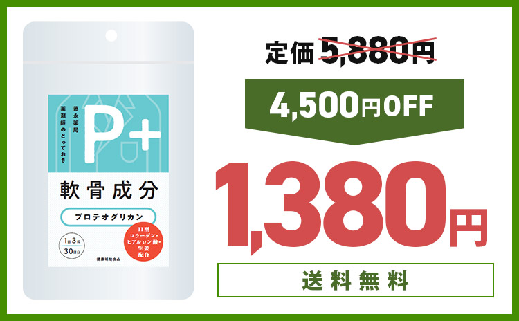 創業42年の老舗薬局・薬剤師が推奨するp+プロテオグリカンは、水以外の軟骨成分を網羅。